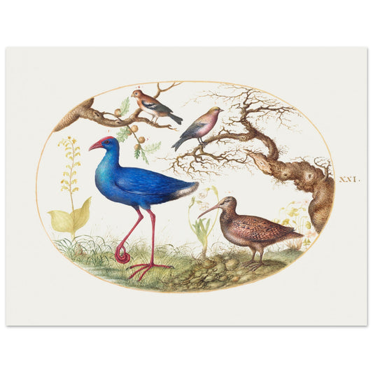 Swamp Hen and Woodcock with Two Finches