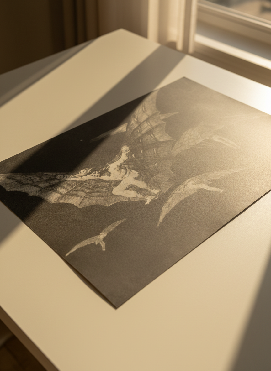Through this imagery, Goya turns flight into an expressive metaphor. The work captures the instability, irrationality, and unpredictable impulses of human behaviour, hallmarks of his late Romantic sensibility. What could be seen as fantastical becomes a commentary on the darker side of human nature, offering a powerful reflection on folly and uncertainty.