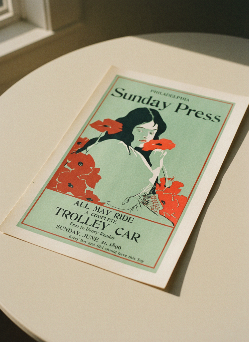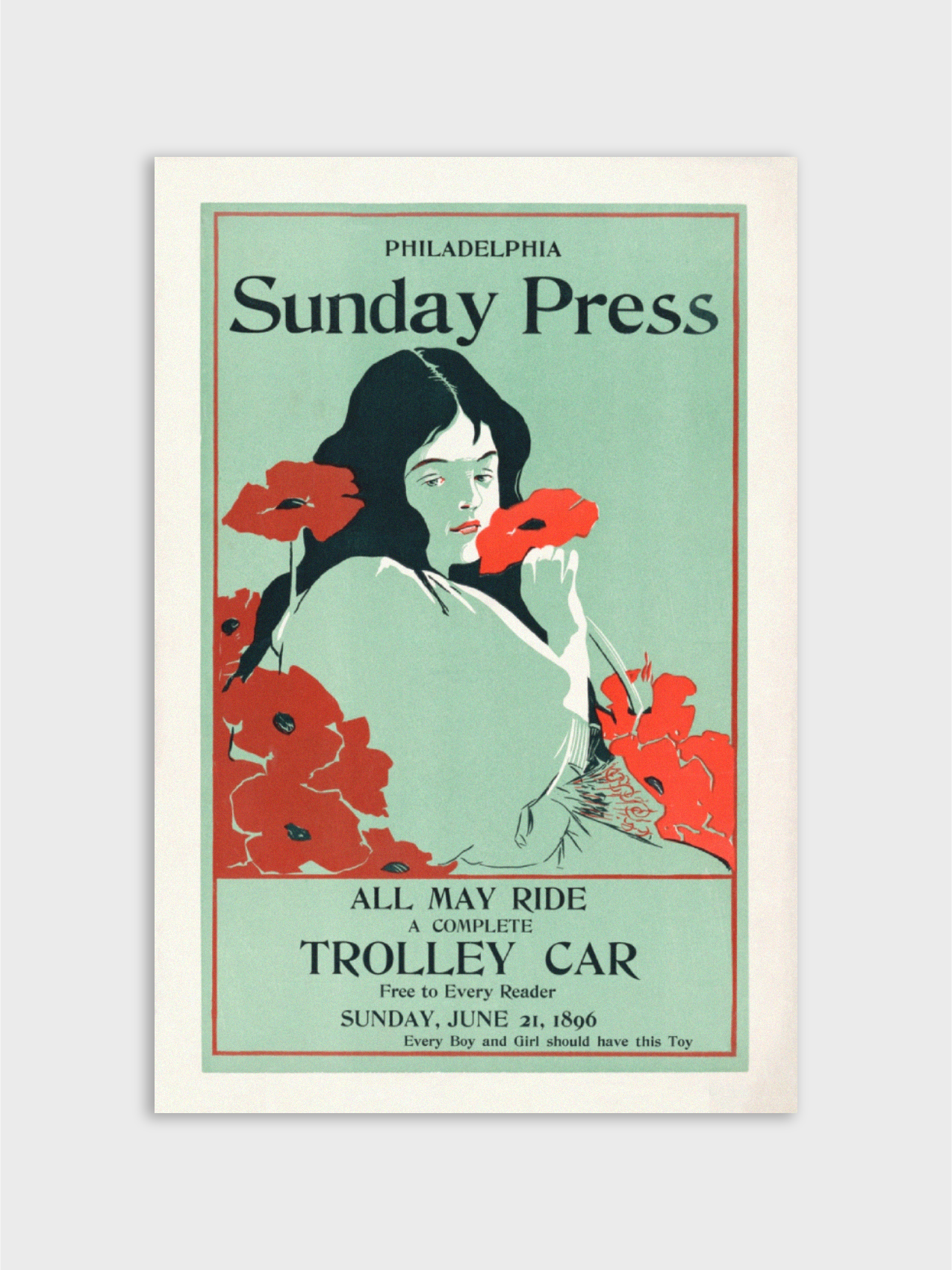 This promotional lithograph by George Reiter Brill was created for The Illustrated American magazine to advertise a chance to win a fully assembled trolley car. The lively Art Nouveau design, with its bold yellow and red palette, captures the modern energy of late 19th-century urban life and the optimism of the era’s commercial art.