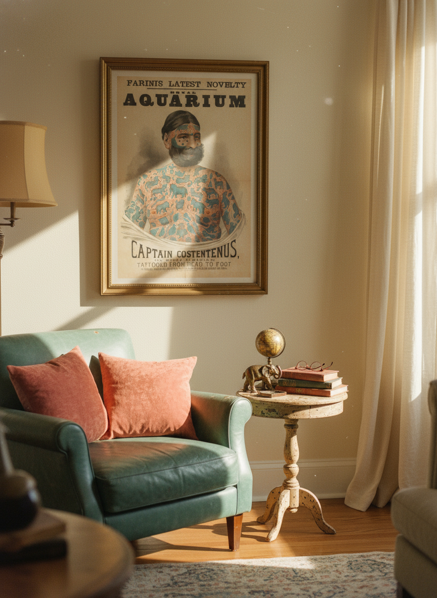This eye-catching poster from the Victorian era advertises Captain George Costentenus, also known as "The Greek Albanian," one of the most well-known sideshow performers of the time. Under P.T. Barnum and displayed at places like the Royal Aquarium, Costentenus was portrayed as a man completely covered in elaborate tattoos, which were purportedly a form of retribution for disobedience in Chinese Tartary.