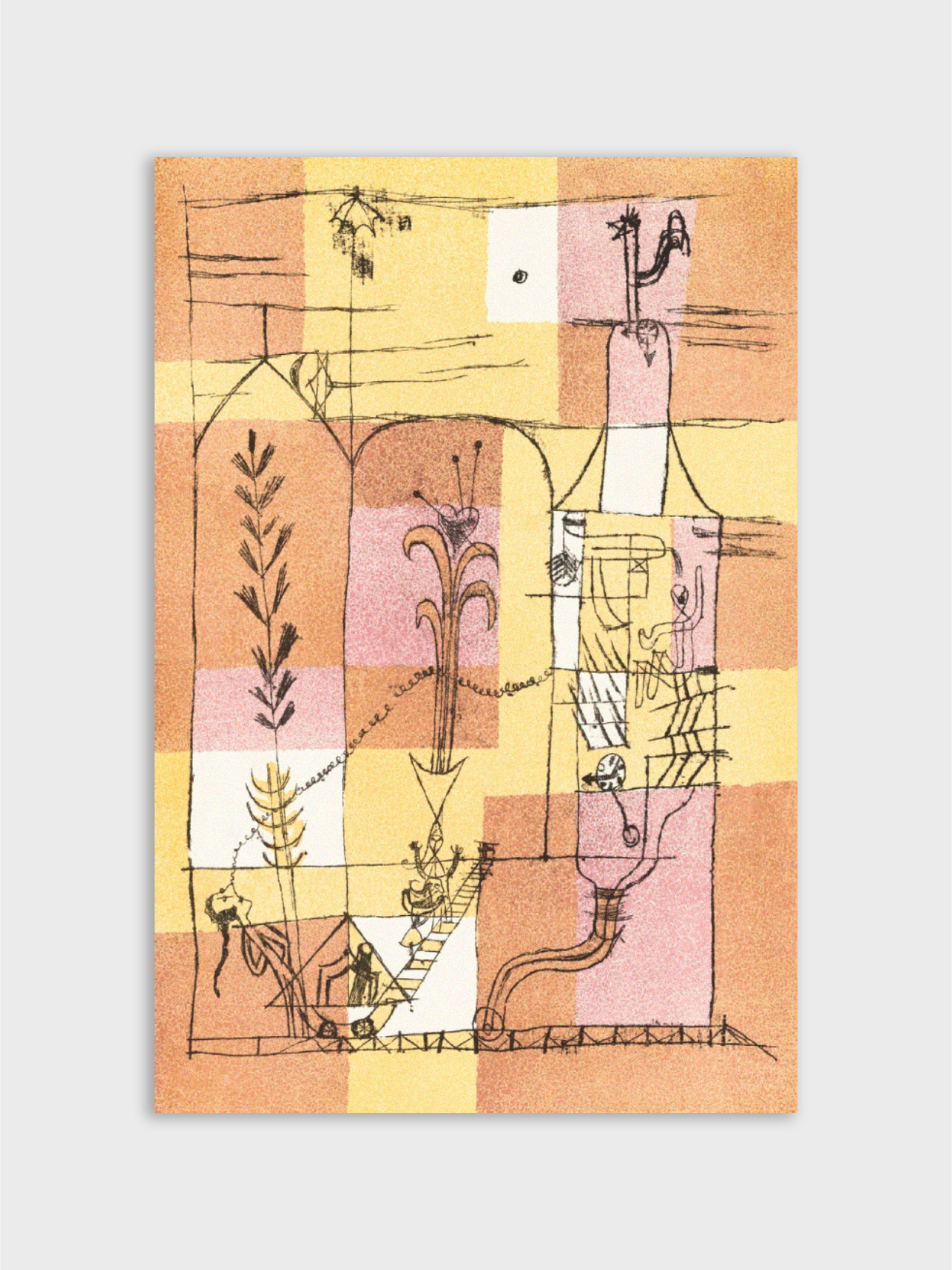 This whimsical pen-and-ink drawing is a delicate, imaginative investigation of line, fantasy, and experimentation from the Bauhaus era. The composition develops into a delicate, surreal web of overlapping lines and otherworldly figures. Klee gives the work a light, narrative charm that feels both intimate and mischievous by drawing inspiration from the fantastical spirit found in literary tales.