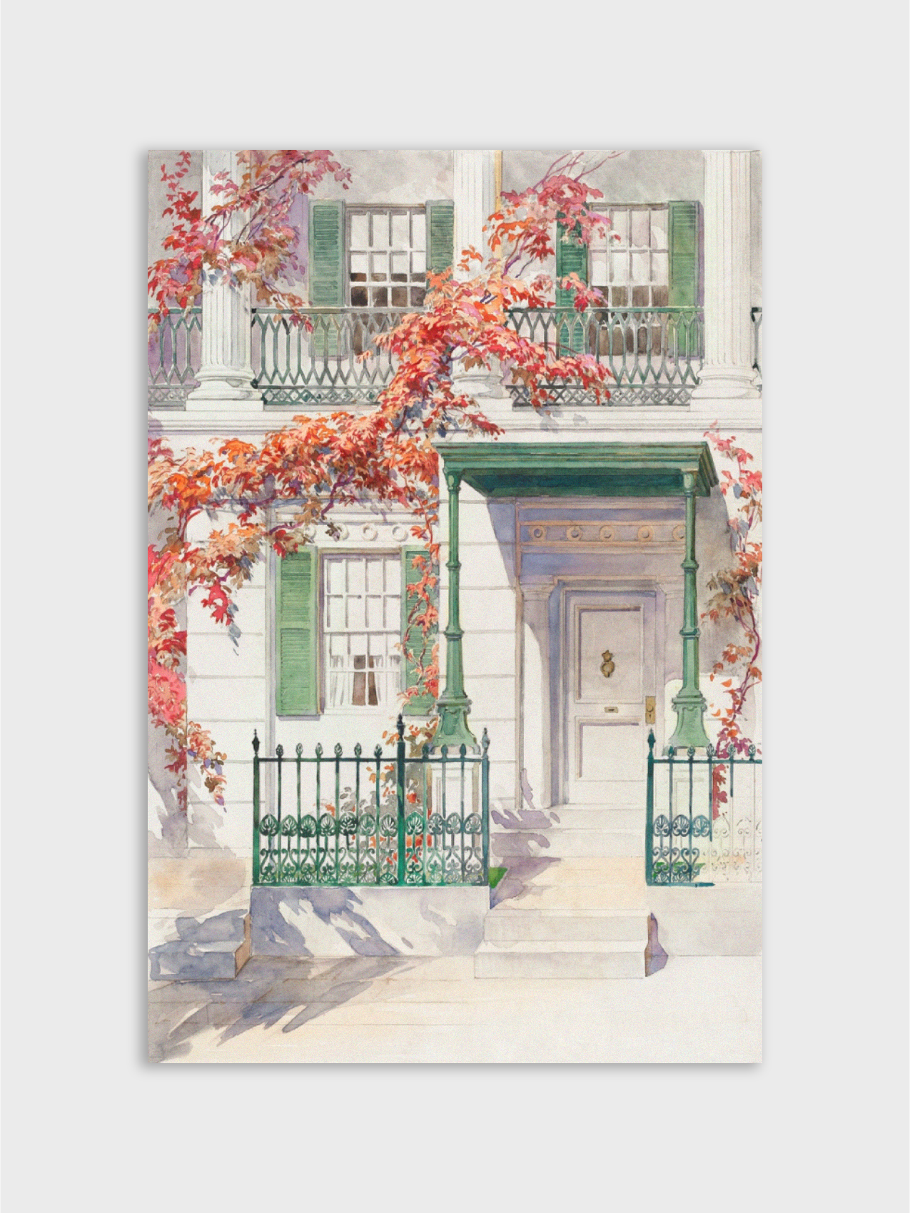 A piece of ornamental iron architecture from the Modernism era is depicted in this delicate watercolour and graphite piece on paperboard. It highlights the elaborate green ironwork of the balcony railings and fence while concentrating on a stately white façade. The meticulous application of paint accentuates the accuracy and artistry of the design, while subtle ochres and browns in the steps and shadows add to the scene's realism.
