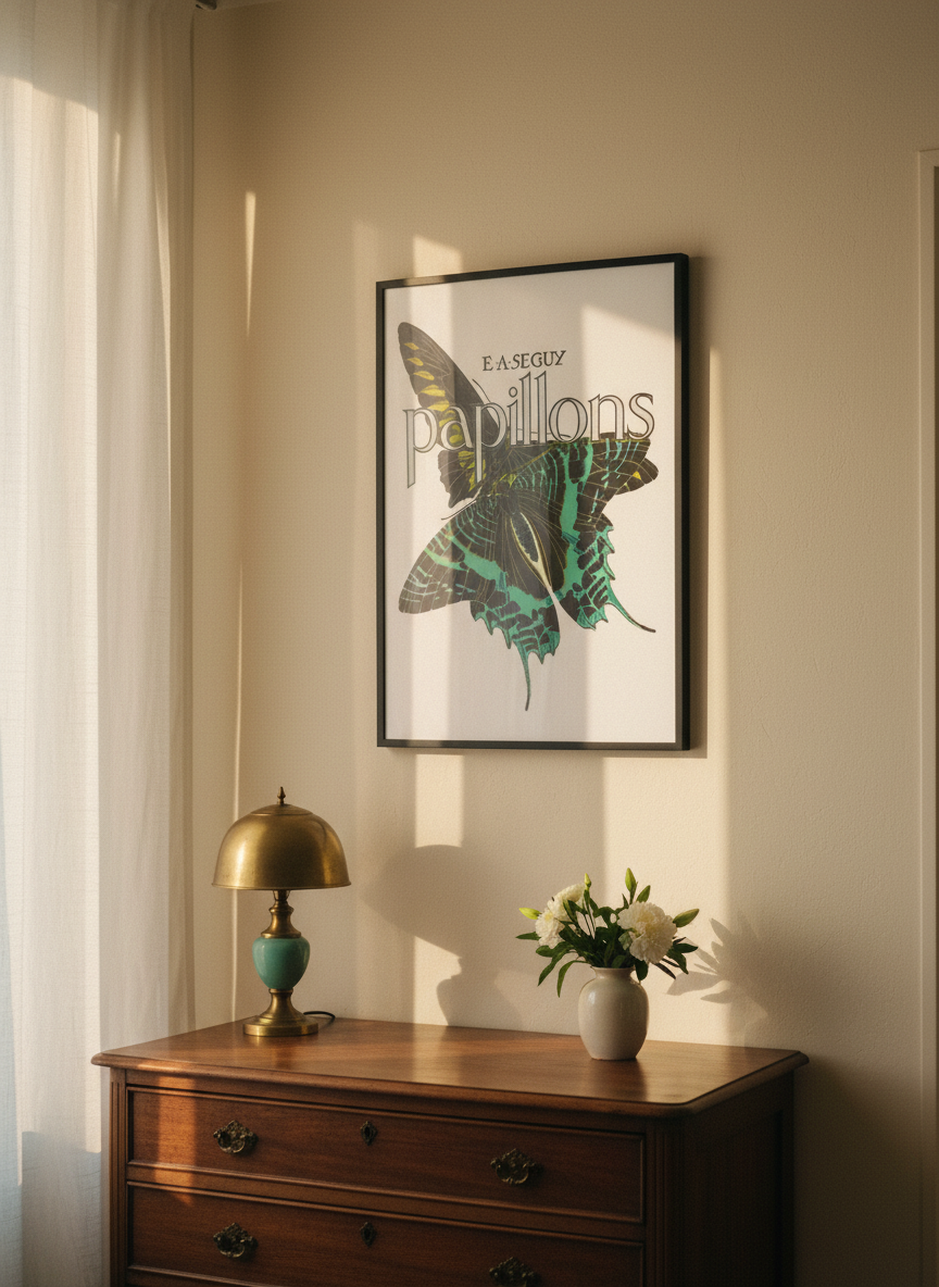 Papillons is a celebration of nature transformed into decorative art. Created in 1925 by Émile-Allain Séguy, this print was originally commissioned as part of a series to inspire modern textiles and wallpapers. It embodies the elegance of Art Nouveau while embracing the precise geometry of Art Deco, merging two influential design movements in a single, refined composition.