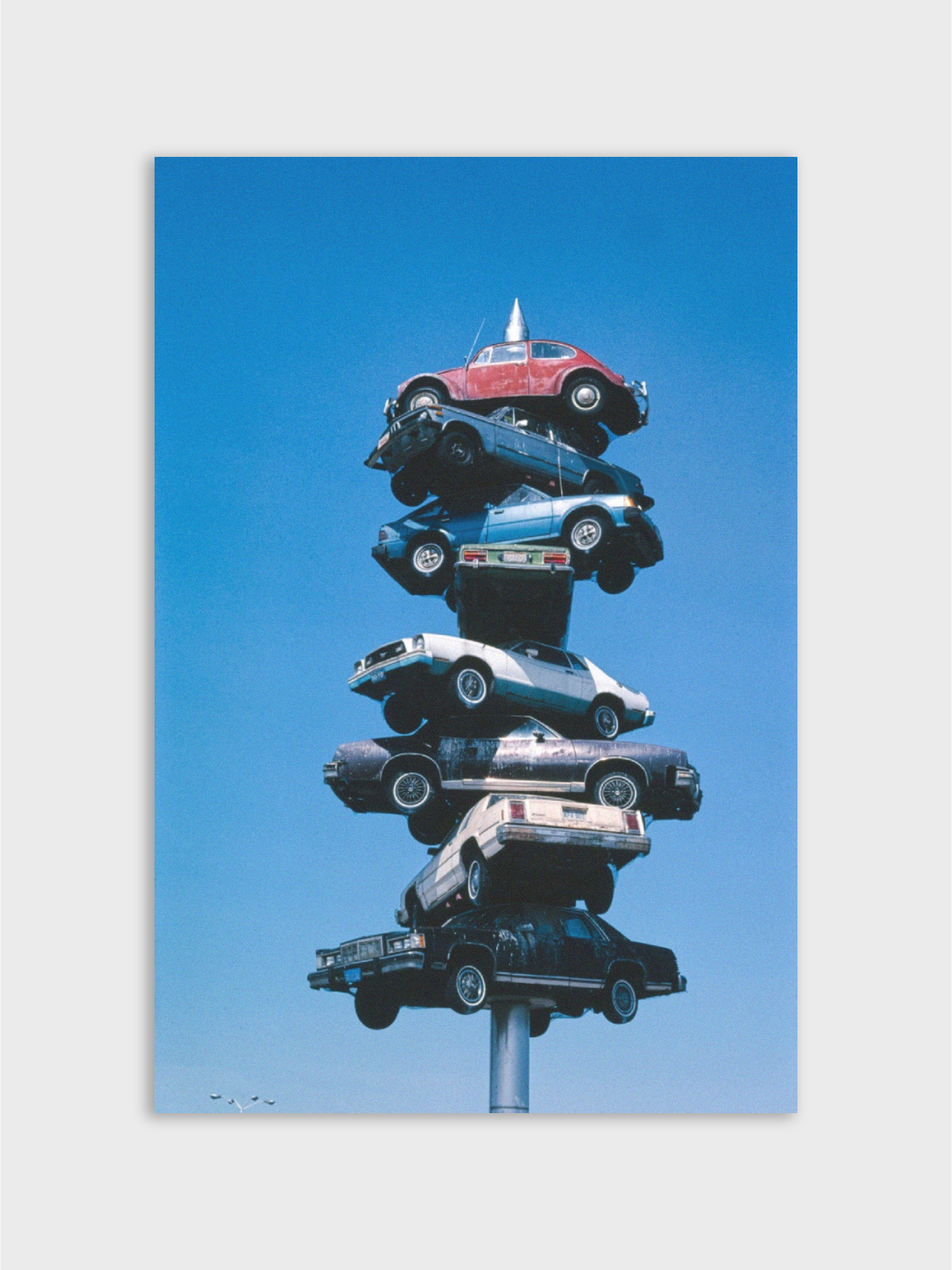 This photograph captures the quirky visual landscape of suburban Illinois and serves as a playful documentation of American roadside vernacular architecture. It displays the distinct personality and optimism of America's built environment and reflects Margolies's fascination with mid-century commercial design. The composition turns ordinary scenes into powerful examinations of contemporary photography and cultural expression by highlighting the happy, quirky shapes of roadside structures with vivid, saturated colour and fine detail.