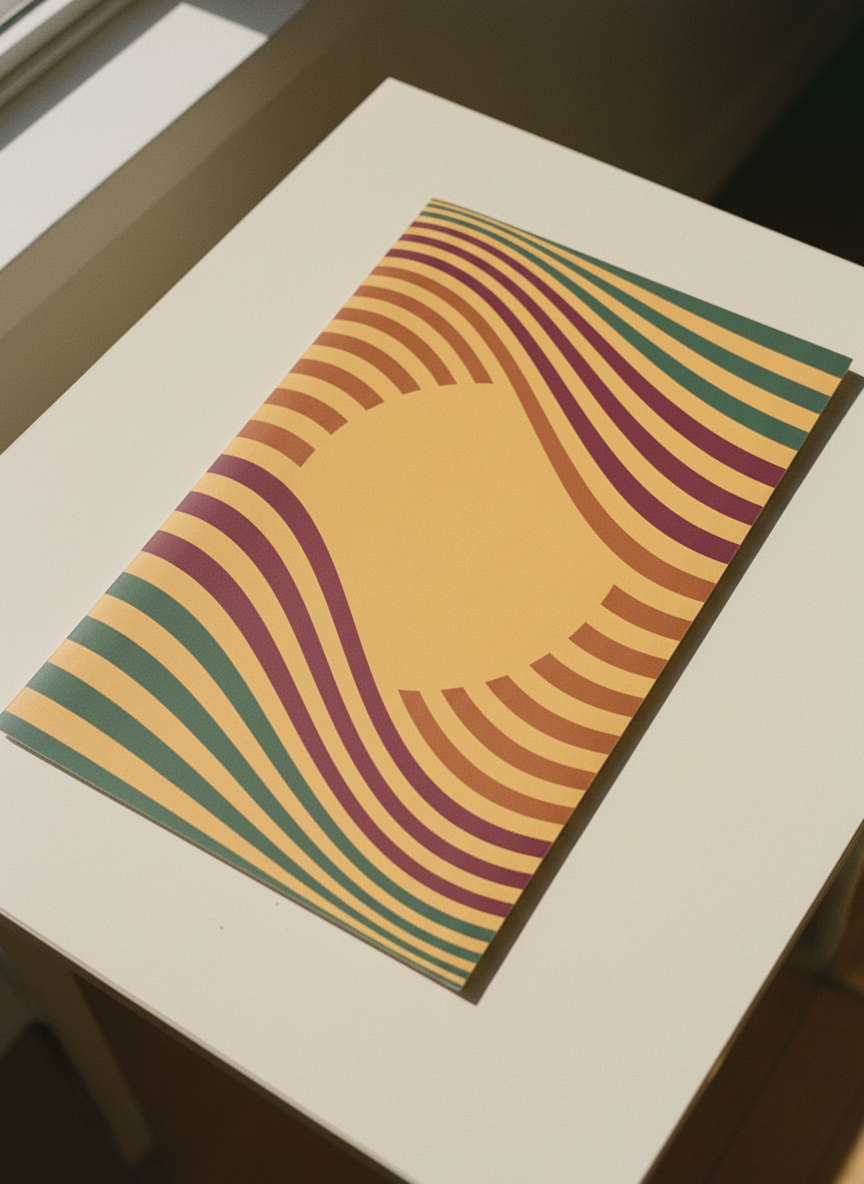 This piece creates a pulsating sense of a moving sunset by employing a geometric framework of waved stripes. Bands of dark bottle green provide a stark contrast to the palette's deep burgundies, mustard yellows, and rust oranges. In the middle of the intense, flowing pattern, a sizeable circle provides a visual break. The end result is a modern, highly ornamental piece that highlights rhythmic flow and colour interaction.