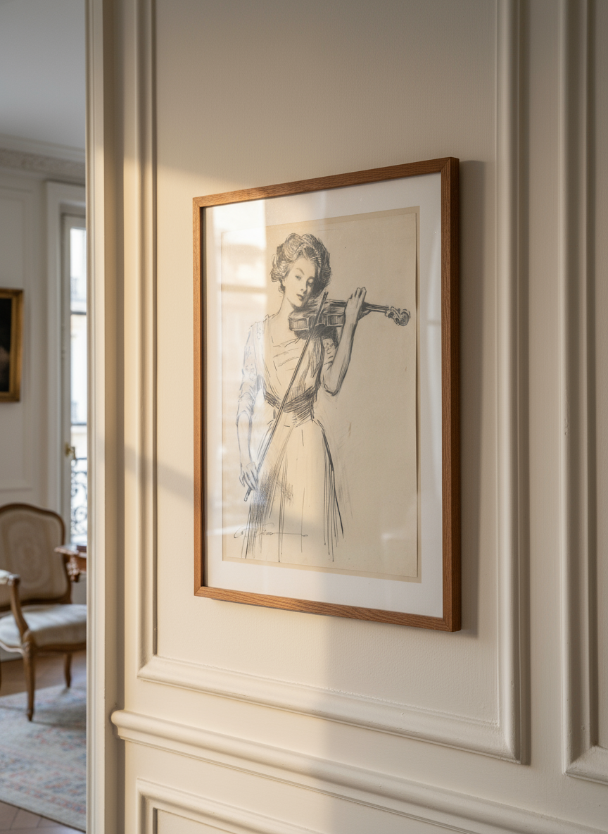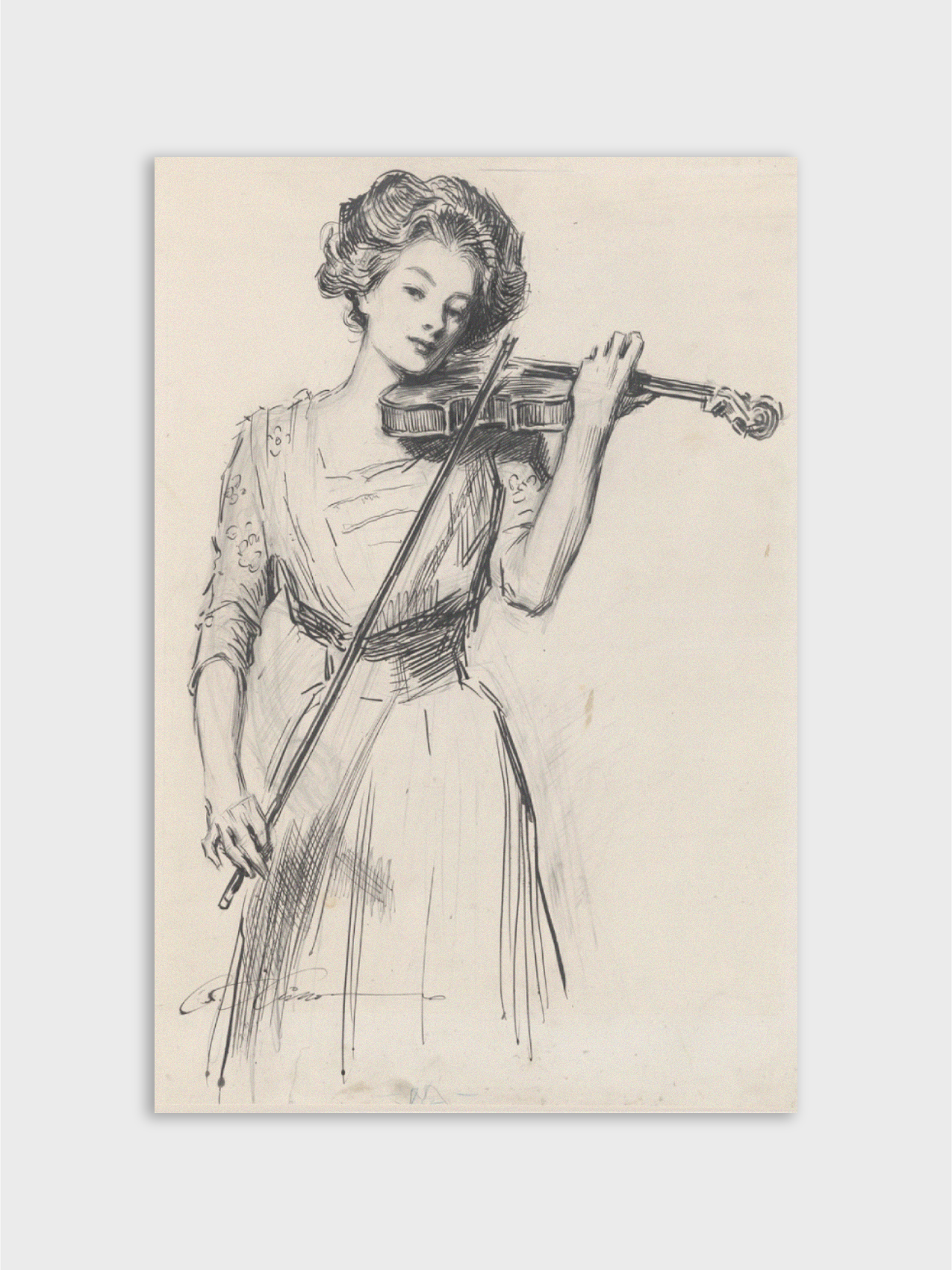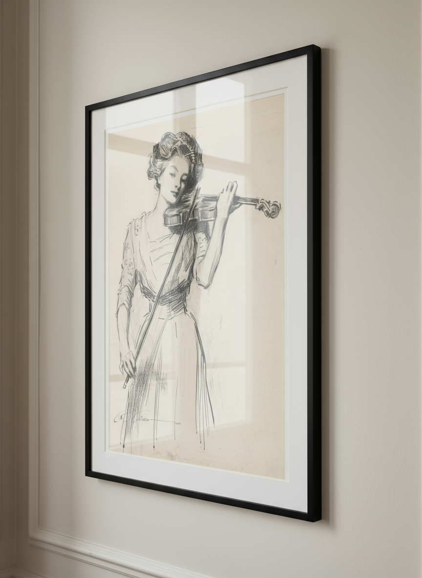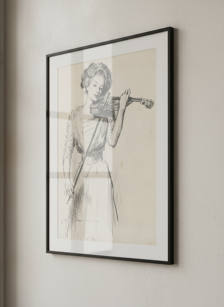 This classic pen and ink drawing portrays a lone Gibson Girl, the period's quintessential representation of grace, wit, and self-reliance. The piece has elegant composition with flowing line-work, both characteristics of the Golden Age of American Illustration. The character, frequently known as The Violinist, personifies the ideal of the "New Woman," emphasising her pursuit of artistic abilities and personal interests outside of the home.