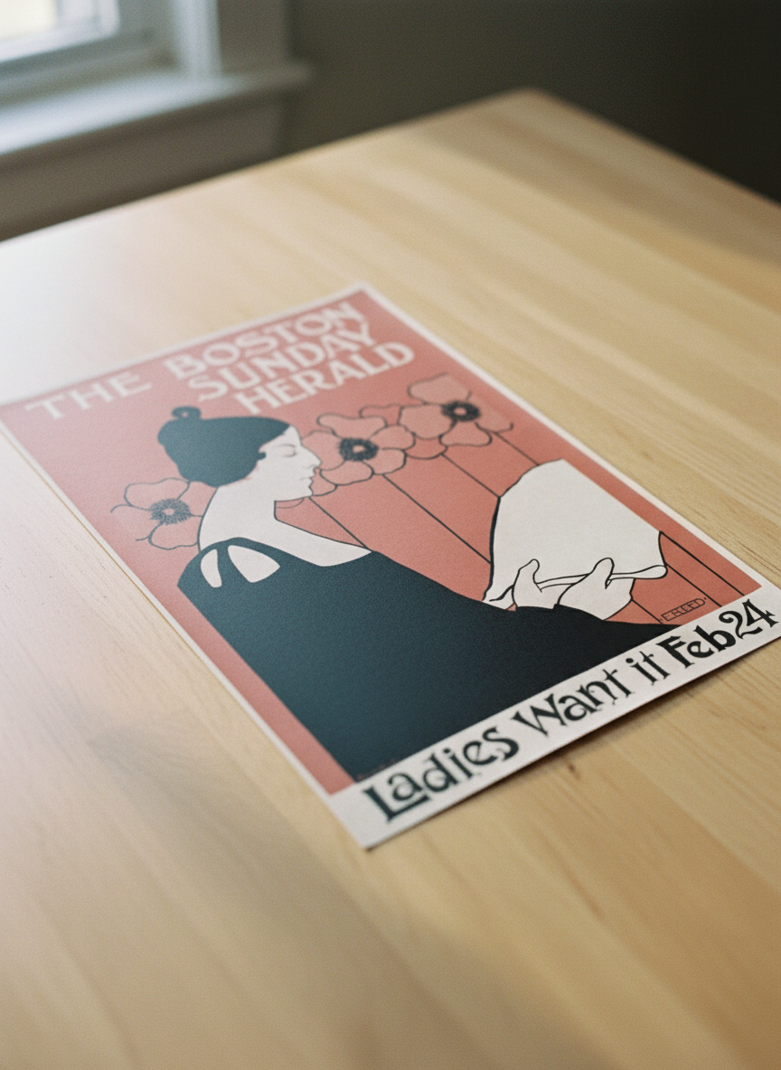 One of the most recognisable pieces by American Art Nouveau pioneer Ethel Reed is this exquisite lithograph. The poster, which promotes the newspaper's "Fashion Supplement," frequently shows a sophisticated woman reading a newspaper surrounded by stylised flowers that might allude to the Language of Flowers, a code used at the time. This piece, praised for its flowing lines and delicate colour scheme, exemplifies Reed's quick ascent to prominence in the male-dominated poster industry of the mid-1890s.