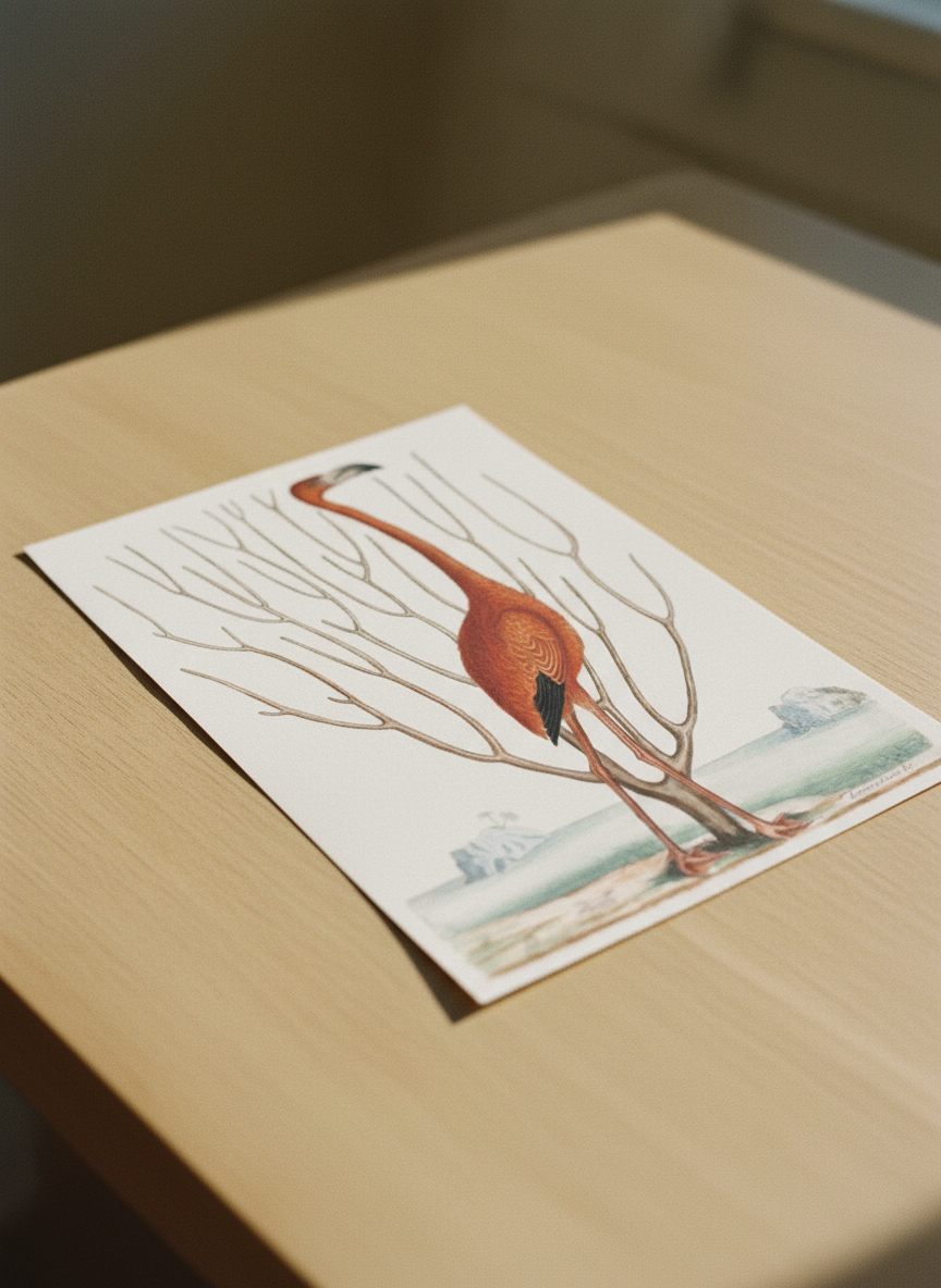 Created for Catesby's publication called "The Natural History of Carolina, Florida, and the Bahama Islands," this print is both aesthetically pleasing and scientifically significant. It shows the flamingo in its natural habitat. In contrast to the greens and blues of its surroundings, the hand-coloured engraving accentuates the bird's striking pink and red plumage. The dramatic composition give the piece a dreamlike quality, foreshadowing elements later embraced by Surrealist artists, where natural subjects are imbued with an imaginative, otherworldly presence.