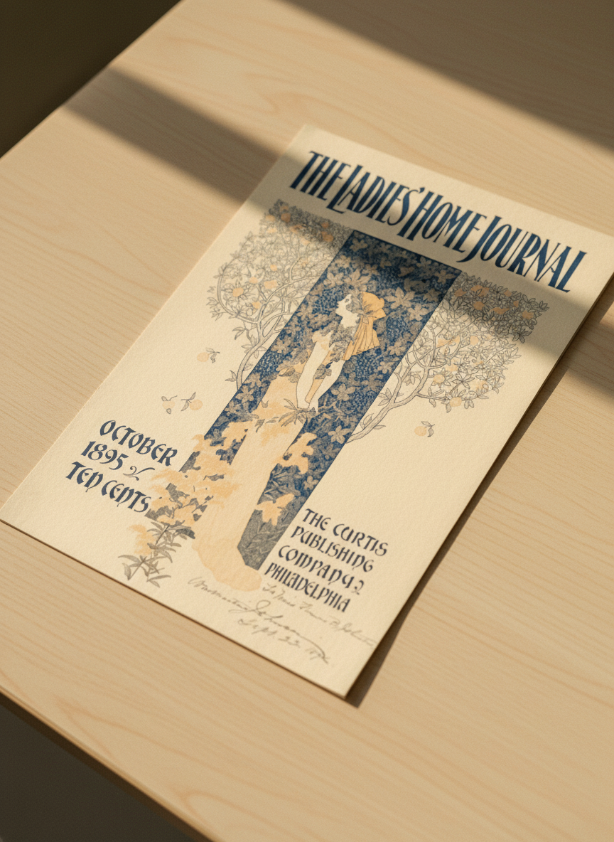 This 1895 lithograph served as a cover design for The Ladies' Home Journal. Through its celebration of the feminine and floral, it embodies the sophisticated aesthetic of the Art Nouveau era and is a charming example of early American commercial art. Graceful lines and flat patches of colour create a visually stunning and aspirational image for the magazine's readership, while autumnal blooms in rich reds, yellows, and greens frame a stylised young woman.