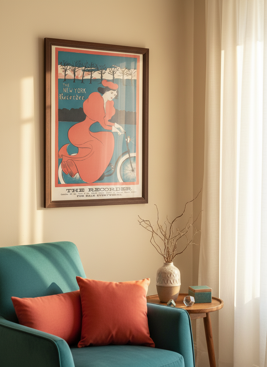 The New York Recorder illustrates the growing influence of Art Nouveau on commercial advertising in the late 19th century. The poster demonstrates how newspapers began to adopt contemporary graphic design trends to capture public attention. Bold colour contrasts, flowing lines, and stylised lettering work together to make the print visually striking, turning a functional announcement into a sophisticated, memorable image.