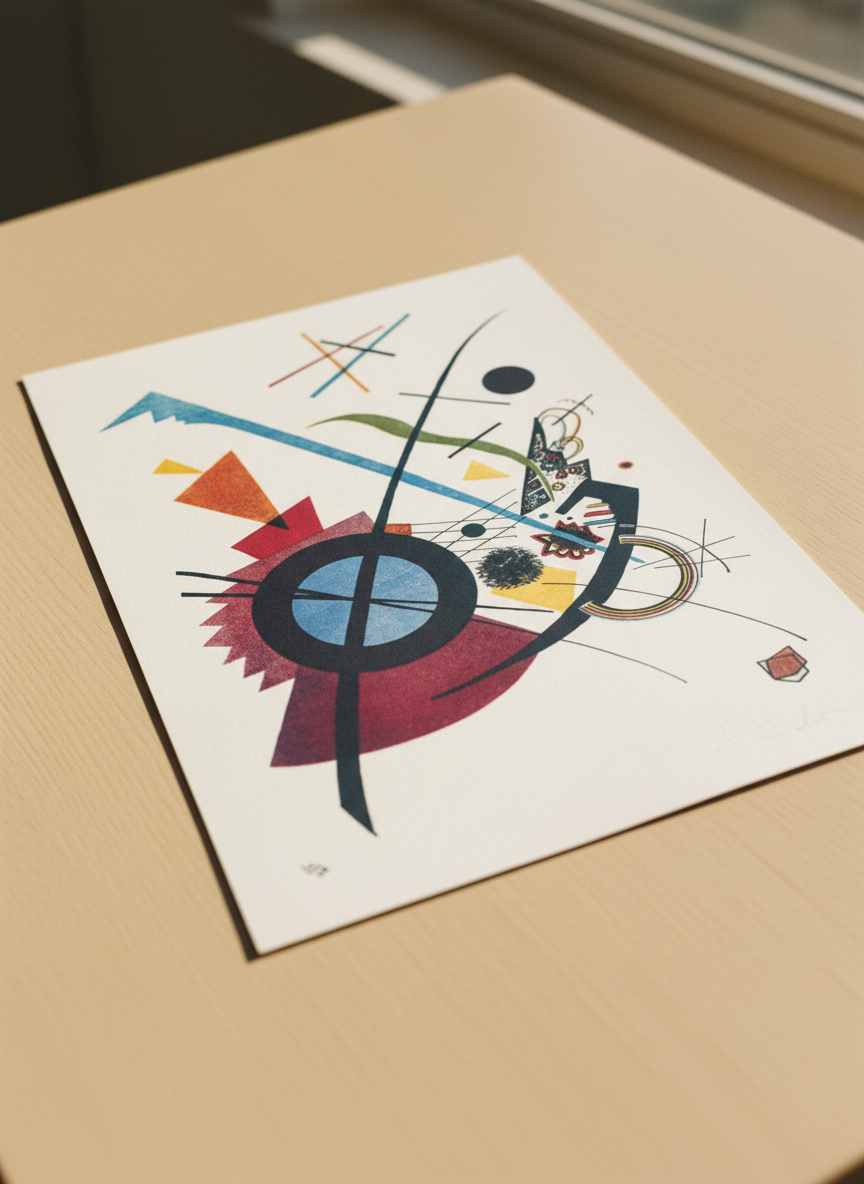 Kandinsky's Bauhaus period, when he investigated the spiritual potential of geometric form and pure colour, is best represented by this striking piece of abstract art. A dynamic arrangement of triangles, circles, and intersecting lines is defined by bold black line-work and floats against a field of vibrant colour. The composition, which is dominated by the title violet, exudes musicality and internal rhythm.