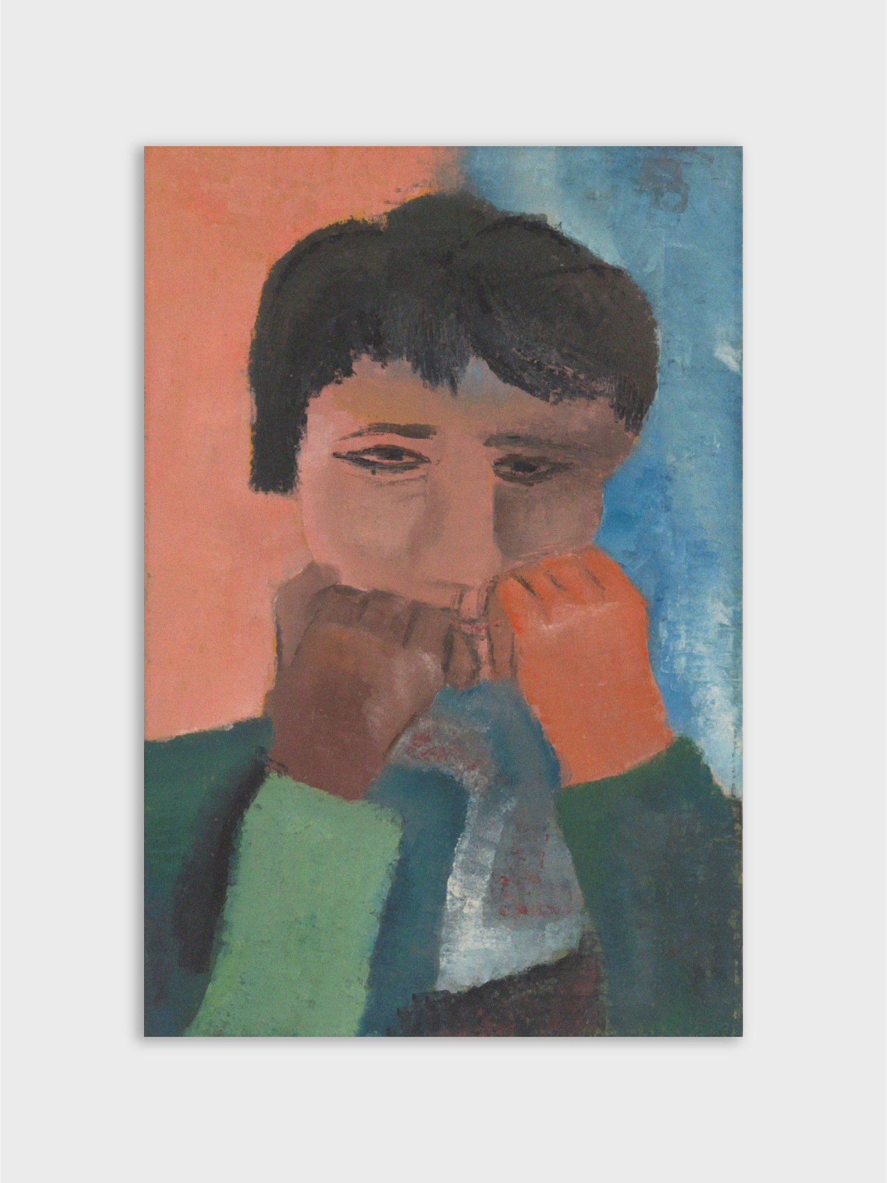 This abstracted print, translated as "Woman Leaning on Two Fists," was produced during the German occupation of the Netherlands. A woman leaning forward on her fists, a gesture laden with tension on both a physical and emotional level. Werkman uses basic printing techniques to create depth and texture with a palette of muted orange and blues. The end effect is a grim, graphic portrait that transcends personal identity and becomes a universal representation of fortitude and inner strength in the face of war's chaos.