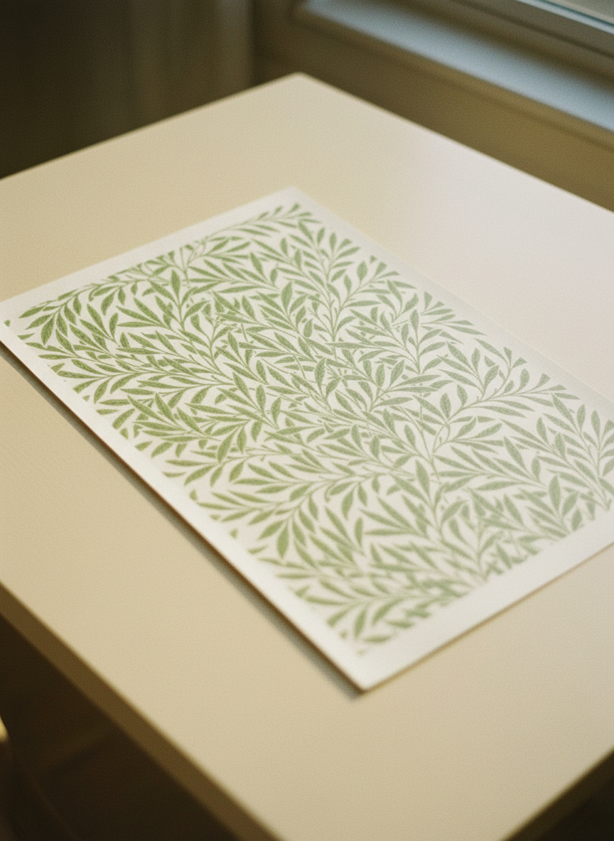This early wallpaper design from 1874 is a prime example of Morris' sophisticated approach to decoration inspired by nature. It comes before his later, more realistic Willow Bough design of 1887 and features stylised willow branches and leaves on a plain background. Morris rejected the heavily shadowed Victorian style in favour of a serene, elegant, and classic sense of design, which is reflected in the flat, two-dimensional aesthetic.