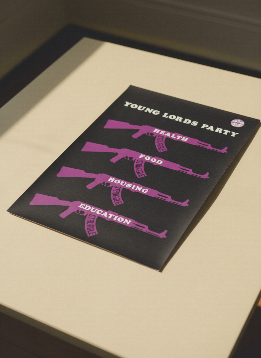 This powerful piece perfectly captures the militant ethos of the Young Lords Party, a groundbreaking civil rights and liberation organisation founded by young Puerto Ricans who were active in Chicago and New York in the late 1960s. The Young Lords, who were influenced by the Black Panther Party, fought against systemic oppression and promoted self-determination by starting community initiatives.